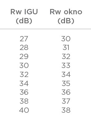 Rw IGU se večinoma giblje v mejah med 30 dB in 50 dB in je predvsem odvisna od debeline stekel (npr. 4, 6, 8 mm), (a)simetrije njihove zgradbe (npr. 4/16Ar/4 ali 6/16Ar/4) in uporabe (akustičnih) folij v lepljenih steklih (npr. 33.1, 44.2A). Razmik med stekli in vrsta žlahtnega plina vpliva v manjši meri. Nekaj primerov je navedenih v spodnji tabeli.