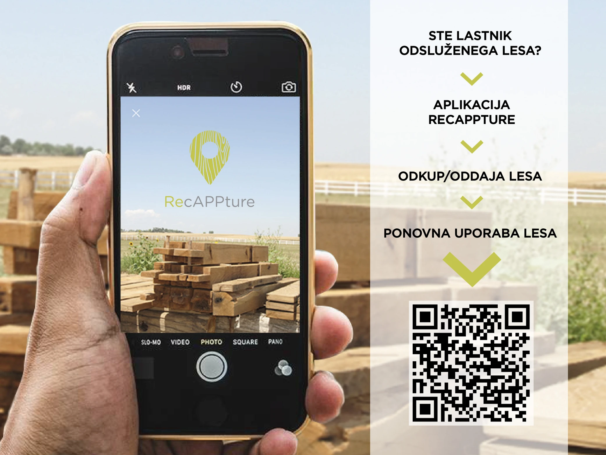 Da bi preprečili običajen sežig takšnega lesa, smo v podjetju v sodelovanju z Univerzo na Primorskem razvili mobilno aplikacijo RECAPPTURE, preko katere lahko v štirih enostavnih korakih objavite vaš odslužen les v bazo, prek katere bodo podjetja in posamezniki lahko dostopali do podatkov o odsluženem lesu, ki ga želijo odkupiti. Vabimo vas, da si apliacijo prenesete in jo začnete uporabljati prek spodnje QR kode. Trenutno aplikacija deluje zgolj v Android okolju, razvijamo pa že njen spletni vmesnik, ki bo omogočal enostavnejšo uporabo in bo vsem zainteresiranim dostopen neglede na operacijski sistem.