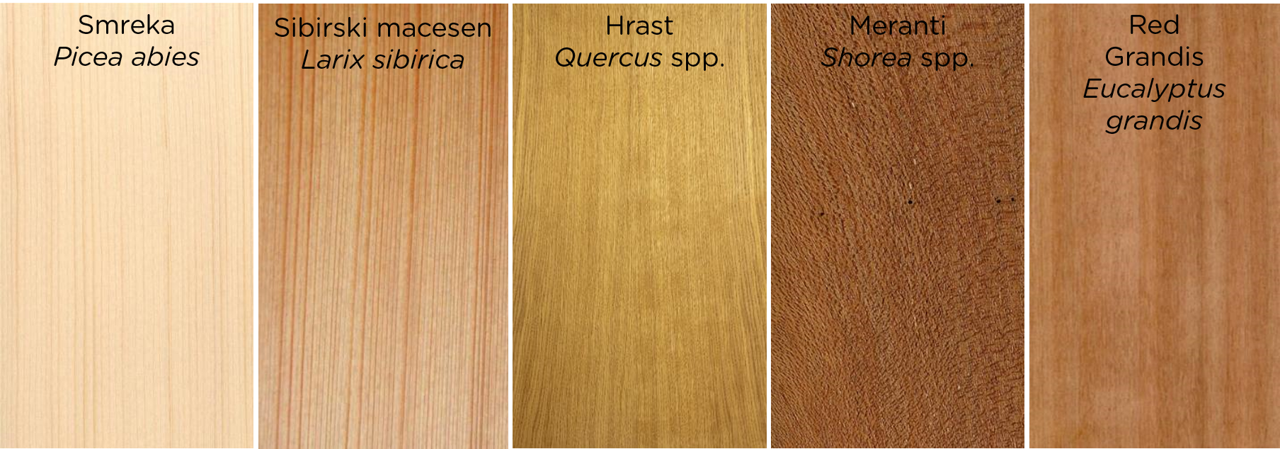 Smreka (Picea abies) in hrast (Quercus spp.) sta slovenskega izvora in izhajata pretežno iz okoliških gozdov, medtem ko sibirski macesen (Larix sibirica) prihaja iz ruskega mesta Nizny Tagil v Sibiriji, meranti (Shorea spp.) iz Malezije in Red grandis (Eucalyptus grandis) iz Urugvaja. O prednostih in slabostih uporabljenih lesnih vrst smo že pisali v ločenem prispevku, tokrat pa bomo izpostavili problematiko transporta in posledično ogljičnega odtisa, ki ga povzroča transport določene lesne vrste. V spodnji tabeli so navedeni podatki o dolžini in vrsti transporta ter gostoti posamezne lesne vrste. Dolžina transporta je bila ocenjena s pomočjo dostopnih podatkov o ladijskem tovornem prometu ter dolžini transporta po cestni infrastrukturi. Omenjeni podatki so bili poleg podatkov o emisijah, ki jih povzroča posamezna vrsta prevoza osnova za izračun emisij CO2, ki se sprostijo pri prevozu 1m3 določene lesne vrste do proizvodnje oken v Žireh.