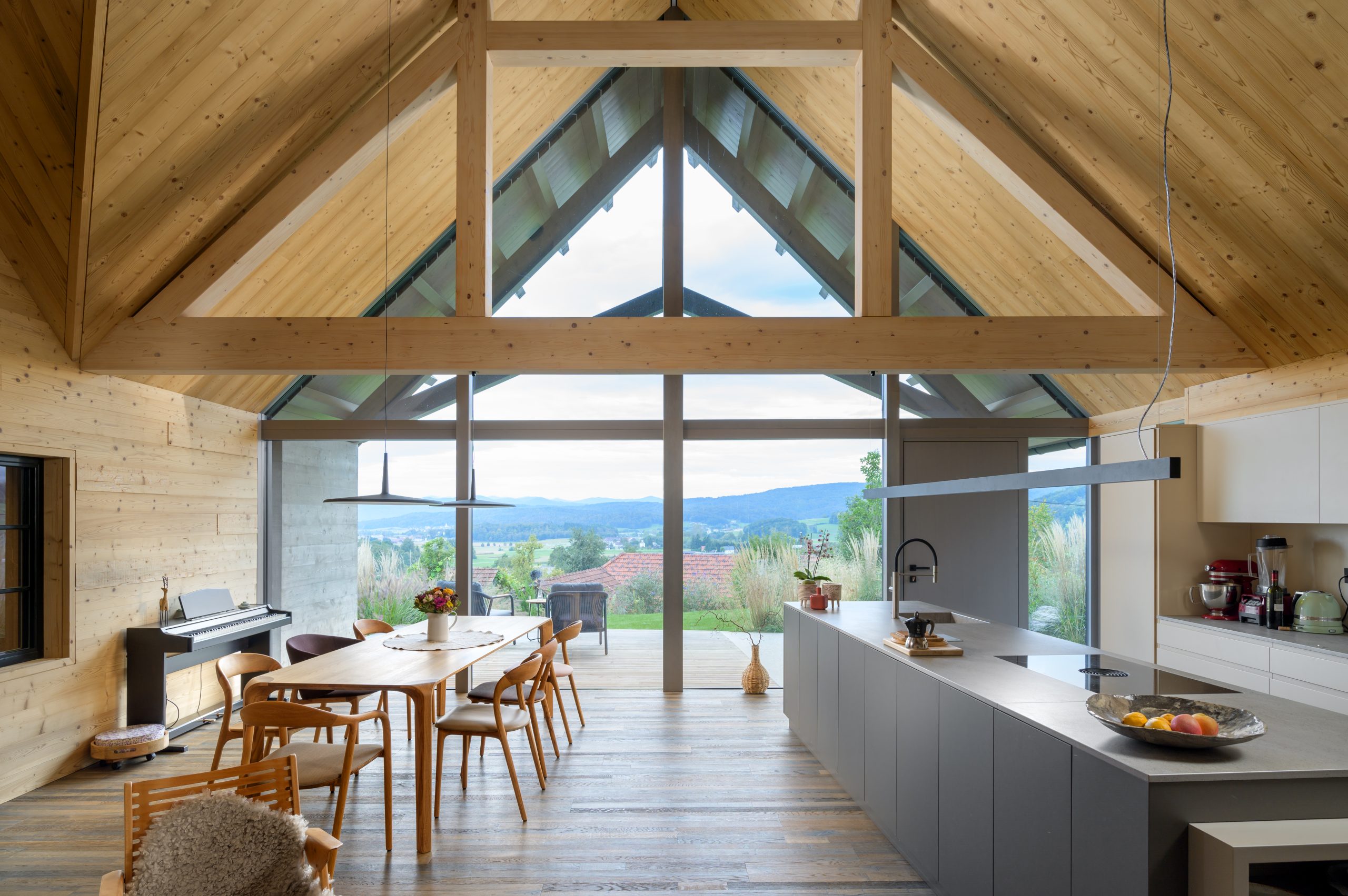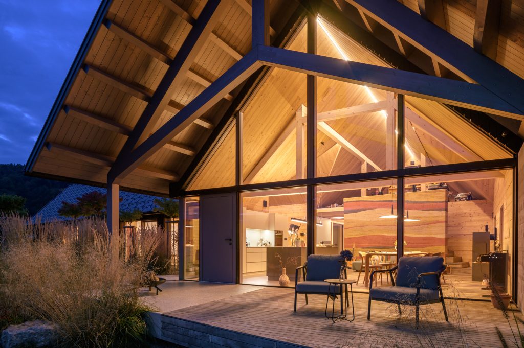 Odličen primer uporabe velikih zasteklitev je Hiša na robu gozda. Zasnovana je bila z idejo popolne povezanosti z naravo. Panoramske zasteklitve segajo od tal do stropa, s pokritimi okvirji, kar omogoča neprekinjen pogled na gozdno okolico. Okna iz macesna zagotavljajo toplino in izolativnost, hkrati pa estetsko dopolnjujejo interier. Oglejte si referenco tukaj.