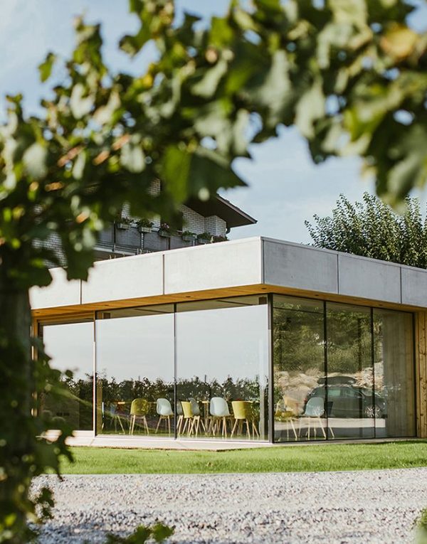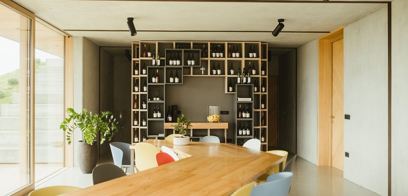 Naloga arhitektov je bila zasnovati ločen degustacijski prostor, kjer gostom ponujajo avtentično predstavitev mladih vipavskih vinarjev. Poleg vina in hrane se v novo zasnovanem prostoru odpirajo tudi atraktivni pogledi v dolino, ki celovito zaokrožijo izkušnjo obiskovalca. Objekt je pravokotne oblike s čistimi linijami. Skozi veliko vogalno stekleno steno ter nadstrešeno teraso fluidno prehajamo iz notranjega v zunanji ambient. Stekleni ovoj obdaja vidna betonska konstrukcija, toplino in domačnost pa daje lesena obloga v notranjosti objekta. (Vir: OHS, foto: Nejc Bole)