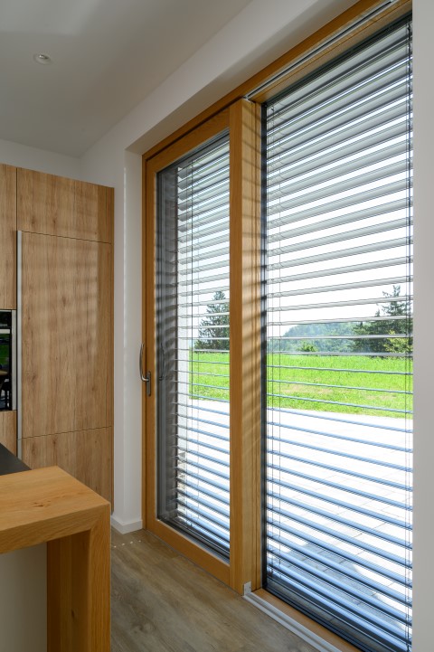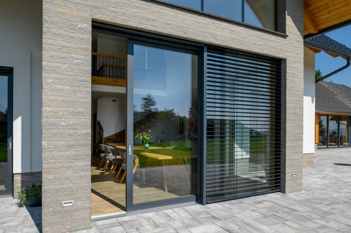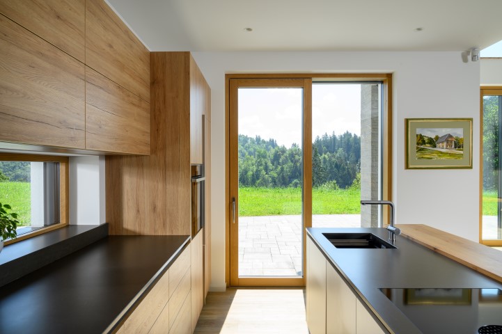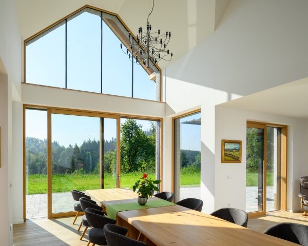 Lastniki so želeli po eni strani arhitekturo čim bolj približati stavbarski tradiciji okolice, po drugi strani pa jo odpreti edinstvenim razgledom na okoliške travnike in gozdove. Čudoviti razgledi se odpirajo skozi velike zasteklitve in drsne panoramske stene. Okenski okvirji iz hrastovega lesa so v notranjosti vidni in lepo uokvirjajo zelene odtenke narave, z zunanje strani pa so pred vremenskimi vplivi zaščiteni z aluminijem v barvi antracita, ki se povezuje z izbrano strešno kritino. (Foto: Miran Kambič)