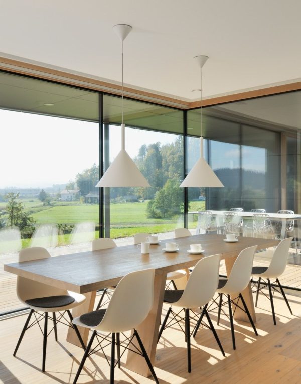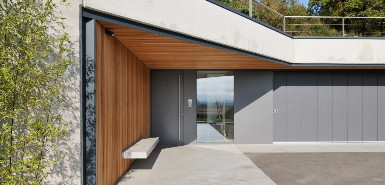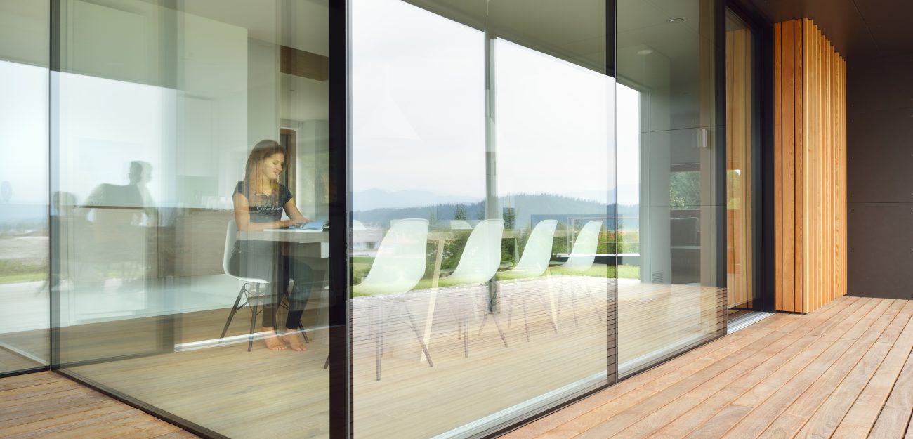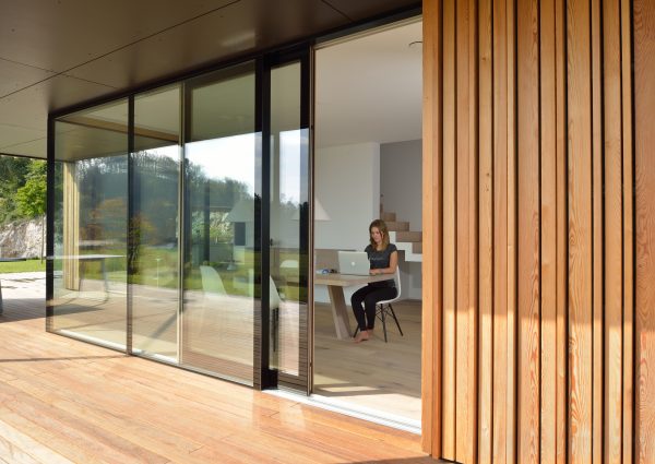 Zgornji plato pa oblikuje zasebni prostor okoli hiše, ki je preko velikih steklenih površin povezan z bivalnimi prostori.
