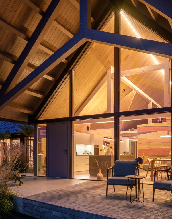 Zasebna hiša v okolici Ivančne Gorice združuje sodobno arhitekturo in naravo. Dva volumna povezuje polodprti prostor, medtem ko velike steklene površine odpirajo poglede na samostan Stična in prinašajo obilico svetlobe. Zasteklitve ustvarjajo občutek prostornosti in povezanosti z zunanjostjo. Fasada v tehniki Shou Sugi Ban, notranjost z lesenimi oblogami ter barvita stena iz zbite zemlje dopolnjujejo igriv, a funkcionalen koncept, ki podpira aktiven življenjski slog.
